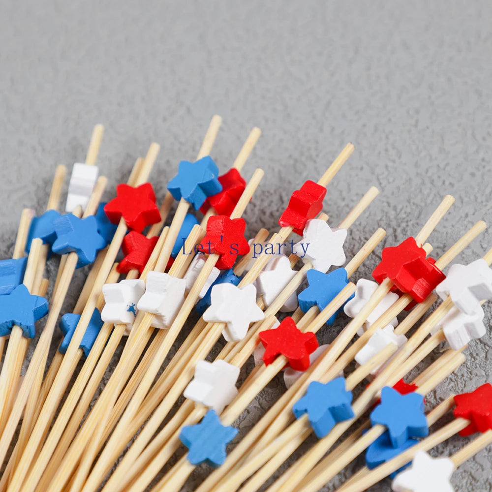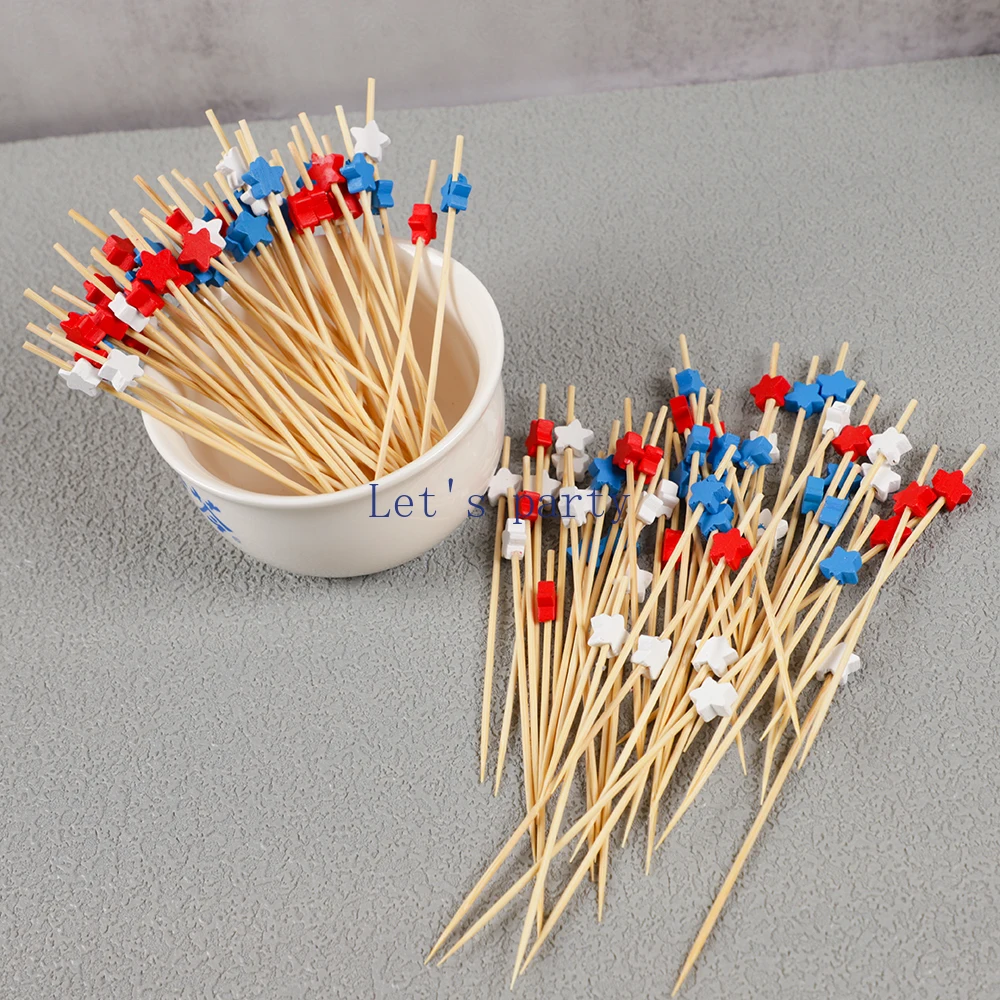 100Pcs Independence Day Theme Disposable Bamboo Food Picks Star Dessert Fruit Forks for 4th of July Birthday Party Decoration
