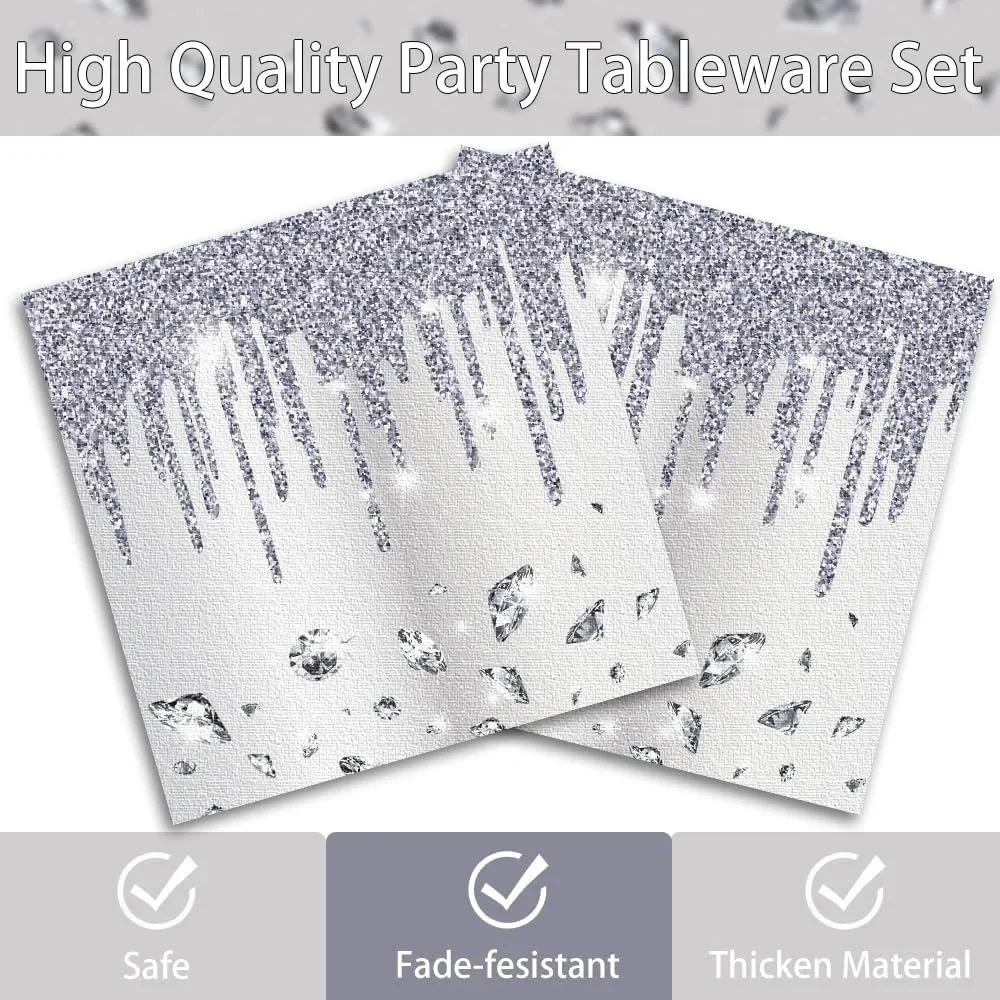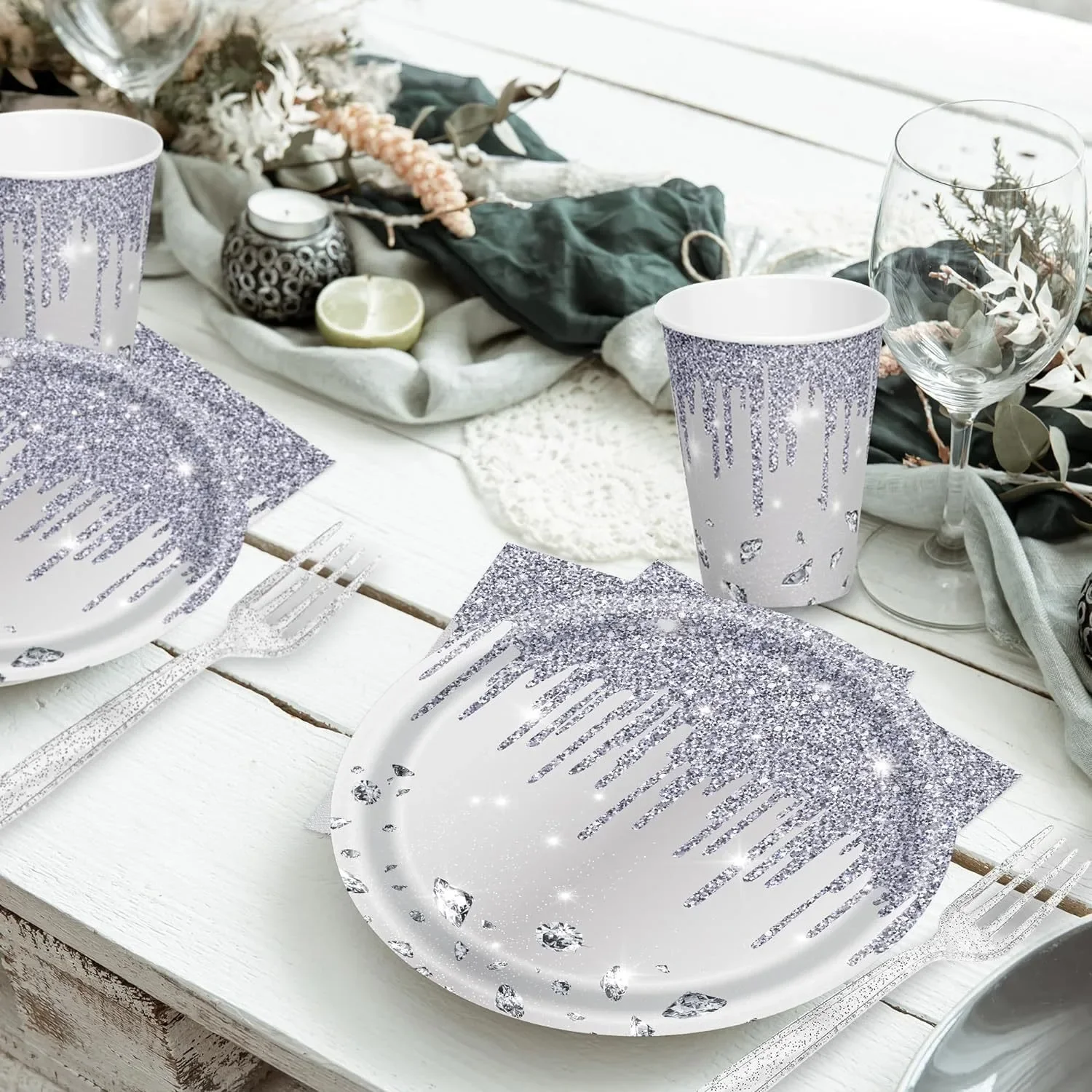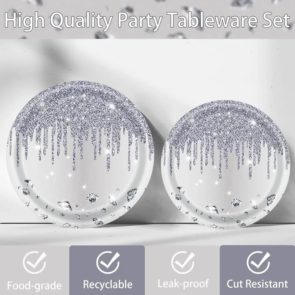 10Guests Silver Shiny Diamond Disposable Tableware Wedding Paper Plate Cups Napkin Happy Princess Birthday Party Decor