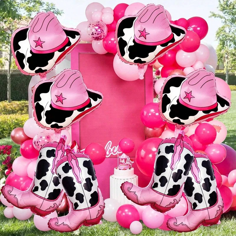 Western themed party balloons, including pink, black and white cowgirl boots balloons and cowgirl hat foil balloons, perfect for bachelorette party decorations for western themed birthday parties, disco decorations